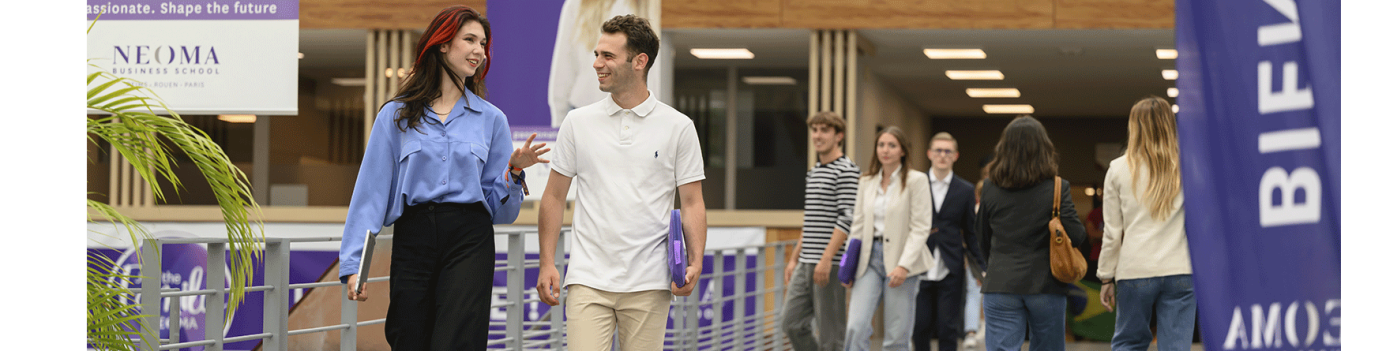 Étudiants échangeant lors d’un événement dédié à la responsabilité sociétale des entreprises chez NEOMA