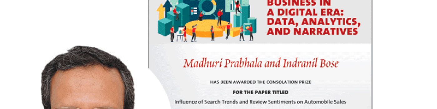 Prof. Indranil Bose (NEOMA) and Ms. Madhuri Prabhala (doctoral student at IIM Calcutta) received a consolation prize of 700 euros for presentation of their paper titled ‘Influence of Search Trends and Review Sentiments on Automobile Sales‘ at the International Communication Management Conference organised by MICA on ‘The Future of Business in a Digital Era: Data, Analytics and Narratives’ held on January 5-7, 2022.