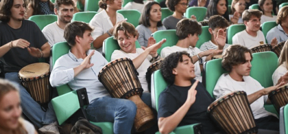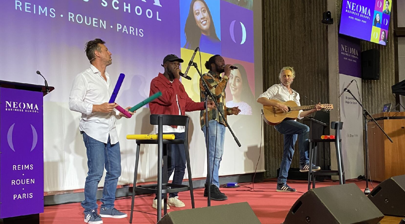 All the students in the venue were also given boomwhakers, a strange tube instrument made from recycled waste material. Together, even though they didn’t know each other yet, they played Viva la Vida by the English group Coldplay. The aim was to create a harmonious sound by listening to each other, so they can form teams that work together with the same rhythm like an orchestra. In Paris, Haka was the event. The rugby players introduced all the new students to this famous choreography of the All Blacks. The aim there was to develop team spirit and a genuine sense of class unity.