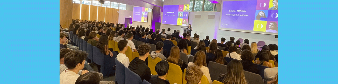9:30 a.m. Delphine Manceau, NEOMA school dean, welcomes the students in the amphitheatre.