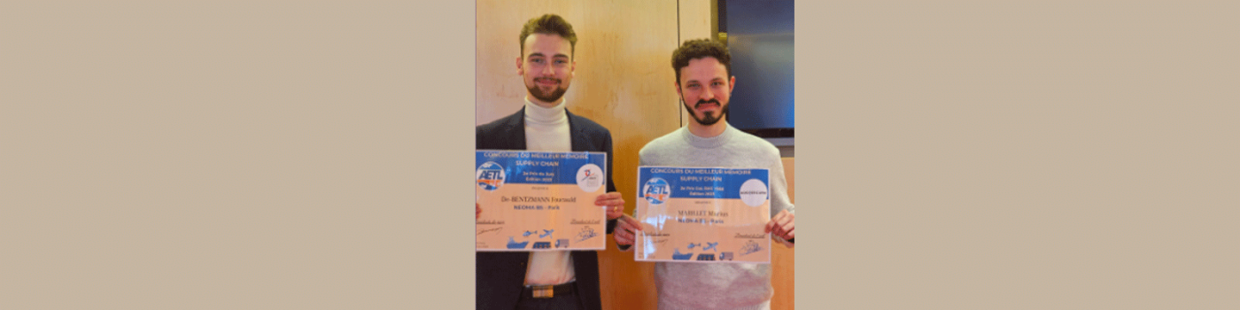 On 21 October, two students from the NEOMA MSc Supply Chain and Digital Transformation programme were awarded prizes at the 2023 Best Supply Chain Theses Competition, organised by the Association of Players, Pupils and Students in Transport and Logistics (AETL).